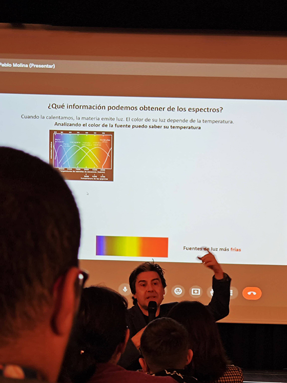 Durante la presentación, Pablo Molina explicó conceptos básicos de ondas, dispersión de la luz, espectroscopía, mediante una presentación amena y accesible a todos los públicos. Se explicó cómo cada especie química presenta su propia huella espectroscópica, y cómo la espectroscopía es una de las técnicas experimentales más extendida en todos los ámbitos científicos.