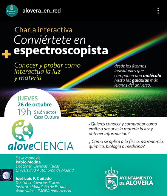 La espectroscopia, la rama de la ciencia que estudia la interacción entre luz y materia, se ha desarrollado a lo largo de los siglos con el objetivo de analizar y comprender nuestro entorno. Inicialmente, mediante el uso de fuentes de luz natural, como el sol o el fuego, junto con el desarrollo de los primeros instrumentos ópticos, hemos sido capaces de estudiar las propiedades físicas y químicas de los objetos que nos rodean. Hoy en día, mediante el desarrollo de fuentes de luz láseres y modernos detectores, somos capaces de explorar mediante técnicas espectroscópicas el mundo a todas las escalas, desde los átomos individuales que componen una molécula hasta las galaxias más lejanas del universo. En esta presentación haremos una breve introducción a las principales propiedades de la luz (de manera más precisa la radiación electromagnética) y los parámetros que la caracterizan. Posteriormente describiremos las bases de la espectroscopia, algunas de las técnicas en las que se basa y los instrumentos más utilizados. De manera teórica y práctica expondremos como analizando la luz que emite o absorbe la materia, somos capaces de obtener información relativa a su temperatura, composición o la distancia a la que se encuentra de nosotros entre otras. Estas características hacen de la espectroscopia una disciplina con importantes aplicaciones en campos de la física, astronomía, química, biología o medicina.